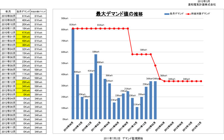 日毎に春らしくなってまいりましたが如何お過ごしでしょうか。おかげ様でこの冬の節電対策にデマンドモニタリングシステムが大いに効果を発揮して前年度実績を大きく下回る事ができました。デマンド値(58kwh→34kwh:41%低減)実績は添付資料参照願います。